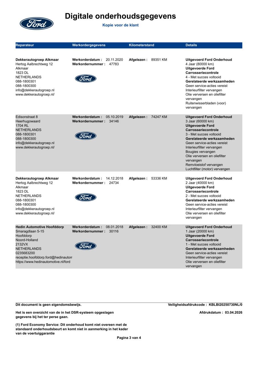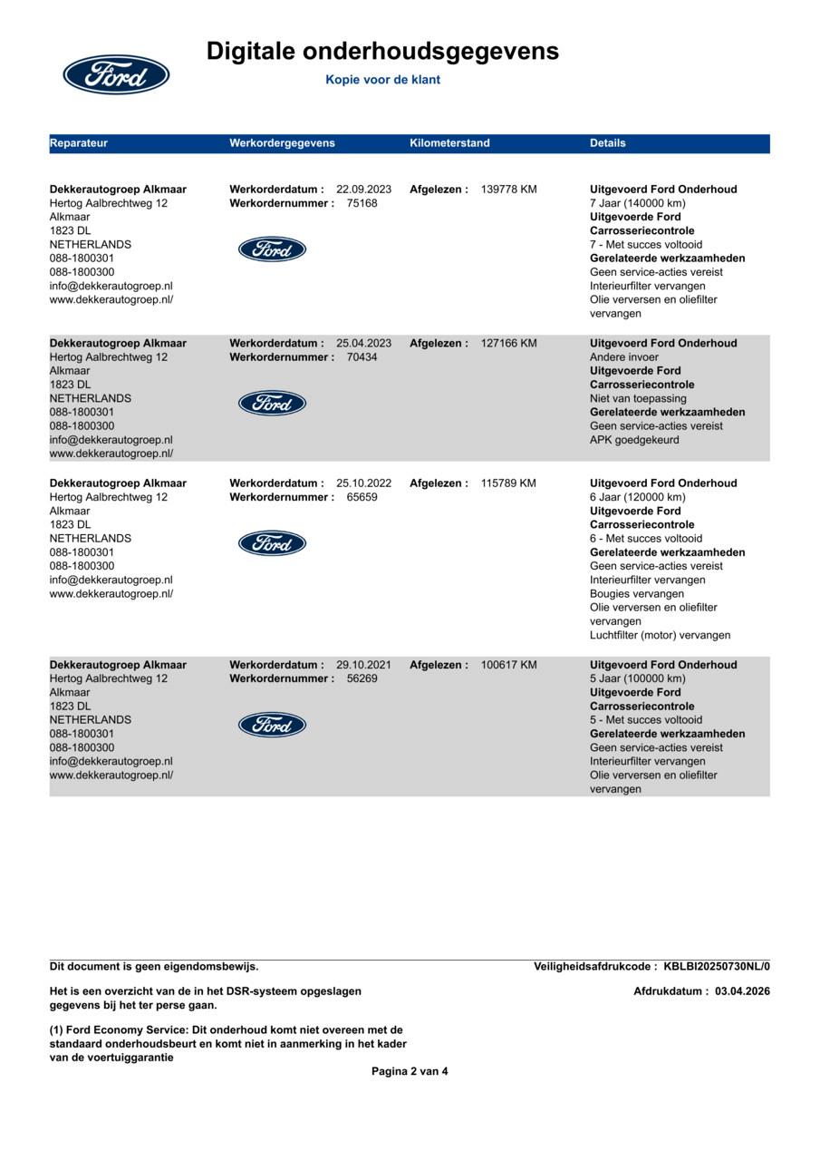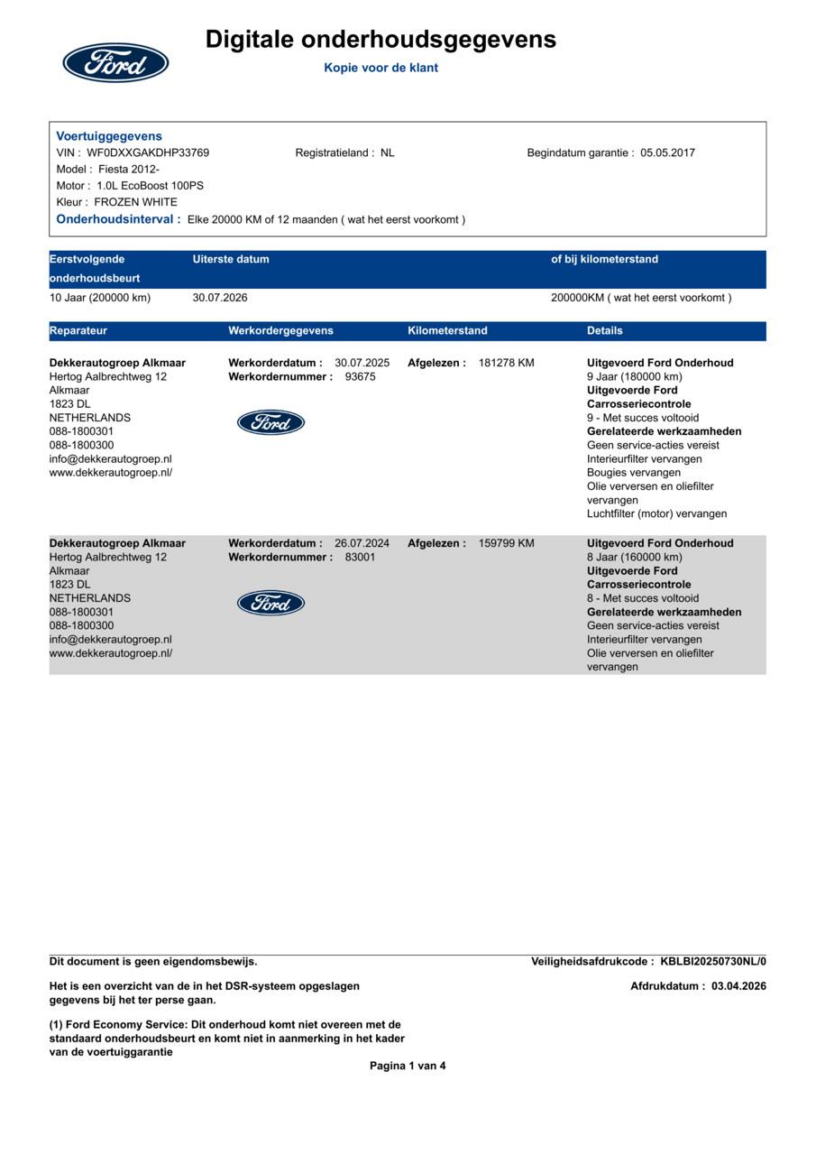 Deze Fiesta heeft een volledig dealer-onderhoudshistorie. Sinds in 2017 zijn alle 9 onderhoudsbeurten uitgevoerd bij Ford-dealers netjes volgens het voorgeschreven interval van 20.000 km of 12 maanden. Bougies, filters, olie en remvloeistof zijn steeds op tijd vervangen. De laatste beurt was in juli 2025 bij 181.278 km. Een auto die aantoonbaar goed is onderhouden — van de eerste tot de laatste kilometer.